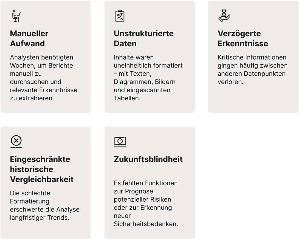 Der Kunde veröffentlicht jährlich seinen „Annual Assurance Report“. Zum Zeitpunkt der Beratung durch FDM hatte sich bereits ein Datenvolumen von über 1000 Seiten angesammelt – vollgepackt mit Hunderten von Unfallmeldungen sowie Tausenden von PDF-Seiten, Bildern und Diagrammen.