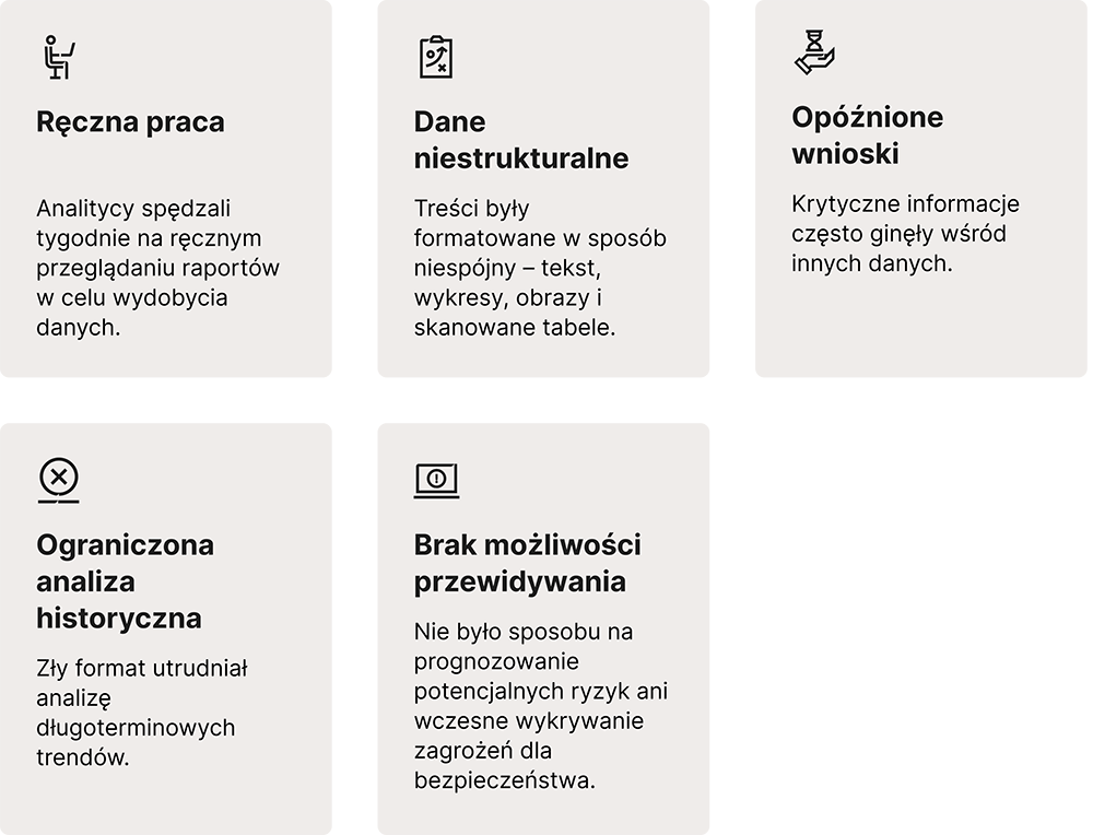 Wcześniej dane były rozproszone w dziewięciu obszarach działalności klienta. Dzięki AI zespoły mogą teraz wykrywać powtarzające się przyczyny i wzorce w całej organizacji oraz identyfikować ukryte ryzyka narastające w czasie.